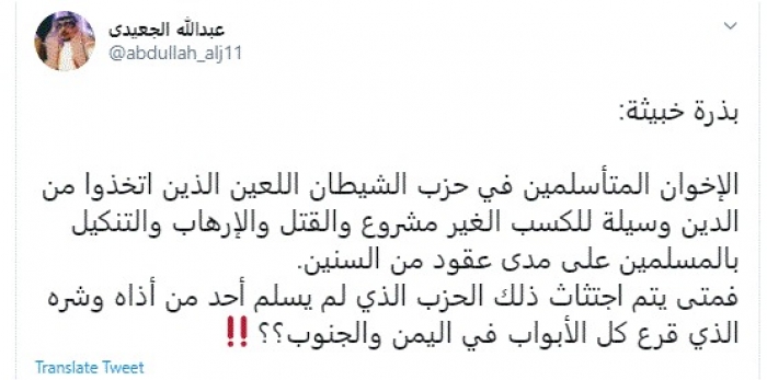 وقال في تغريدة عبر "تويتر" رصدها "المشهد العربي": "بذرة خبيثة: الإخوان المتأسلمين في حزب الشيطان اللعين الذين اتخذوا من الدين وسيلة للكسب الغير مشروع والقتل والإرهاب والتنكيل بالمسلمين على مدى عقود من السنين".