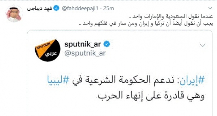 وقال في تغريدة عبر "تويتر" رصدها "المشهد العربي": "عندما نقول السعودية والإمارات واحد.. يجب أن نقول أيضا أن تركيا و إيران ومن سار في فلكهم واحد".