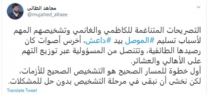 وقال في تغريدة عبر "تويتر" رصدها "المشهد العربي": "التصريحات المتناغمة للكاظمي والغانمي وتشخيصهم المهم لأسباب تسليم الموصل بيد داعش، أخرس أصوات كان رصيدها الطائفية، وتتنصل من المسؤولية عبر توزيع التهم على الأهالي والعشائر".