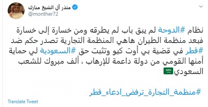 تفاعل المدون السعودي البارز منذر آل الشيخ مبارك، اليوم، مع هاشتاج "منظمة التجارة ترفض إدعاء قطر".