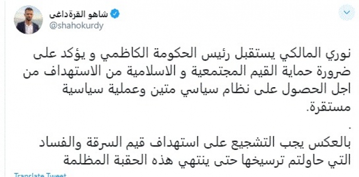 علق الكاتب الصحفي العراقي شاهو القرةداغي، اليوم، على استقبال رئيس الوزراء العراقي الأسبق نوري المالكي، لرئيس الحكومة العراقية مصطفى الكاظمي.