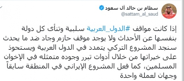 وكتب عبر تغريدة له على "تويتر" رصدها " المشهد العربي":" إذا كانت مواقف الدول العربية سلبية وتنأى كل دولة بنفسها عن الأحداث ولا يوجد موقف حازم وجاد ضد ما يحدث سنجد المشروع التركي يتمدد في الدول العربية ويستحوذ على خيراتها من خلال أدوات تبرر وجوده متمثلة في الإخوان المسلمين، كما فعل المشروع الإيراني في المنطقة سابقاً وجهان لعملة واحدة.