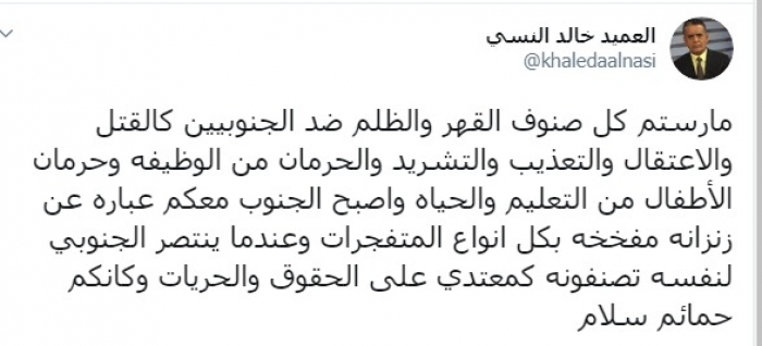 وكتب عبر تغريدة له على "تويتر" رصدها "المشهد العربي": "مارستم كل صنوف القهر والظلم ضد الجنوبيين كالقتل والاعتقال والتعذيب والتشريد والحرمان من الوظيفة وحرمان الأطفال من التعليم والحياة وأصبح الجنوب معكم عبارة عن زنزانة مفخخة بكل أنواع المتفجرات وعندما ينتصر الجنوبي لنفسه تصنفونه كمعتدٍ على الحقوق والحريات وكأنكم حمائم سلام".
