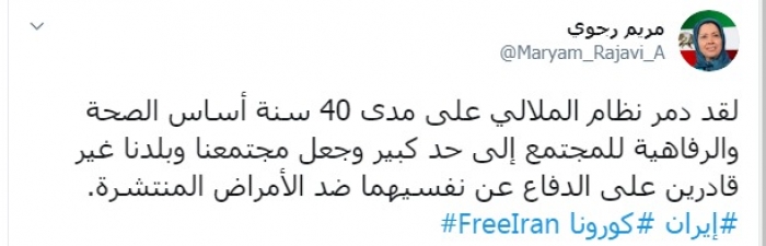 وكتبت عبر تغريدة لها على "تويتر" رصدها " المشهد العربي": "لقد دمر نظام الملالي على مدى 40 سنة أساس الصحة والرفاهية للمجتمع إلى حد كبير وجعل مجتمعنا وبلدنا غير قادرين على الدفاع عن نفسيهما ضد الأمراض المنتشرة".