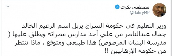 وكتب عبر تغريدة له على "تويتر" رصدها " المشهد العربي": "وزير التعليم في حكومة السراج يزيل اسم الزعيم الخالد جمال عبدالناصر من على أحد مدارس مصراته ويطلق عليها ( مدرسة البنيان المرصوص) هذا طبيعي ومتوقع ، ماذا ننتظر من حكومة الإرهابيين ".