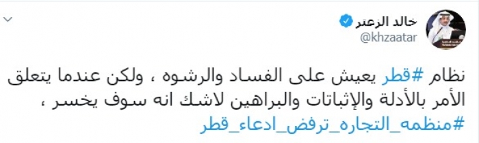 وكتب عبر تغريدة له على "تويتر" رصدها " المشهد العربي": "نظام قطر يعيش على الفساد والرشوة، ولكن عندما يتعلق الأمر بالأدلة والإثباتات والبراهين لاشك أنه سوف يخسر".