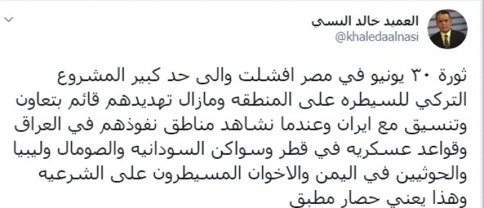 وكتب عبر تغريدة له على "تويتر" رصدها " المشهد العربي" :"ثورة ٣٠ يونيو في مصر أفشلت وإلى حد كبير المشروع التركي للسيطرة على المنطقة ومازال تهديدهم قائم بتعاون وتنسيق مع إيران وعندما نشاهد مناطق نفوذهم في العراق وقواعد عسكرية في قطر وسواكن السودانية والصومال وليبيا والحوثيين في اليمن والإخوان المسيطرون على الشرعية وهذا يعني حصار مطبق".