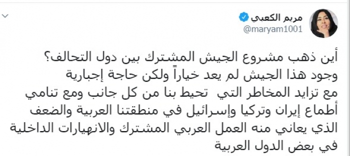 طالبت الكاتبة والإعلامية الإماراتية مريم الكعبي، اليوم، بإنشاء جيش مشترك بين دول التحالف مع تزايد المخاطر التي تواجه الوطن العربي.