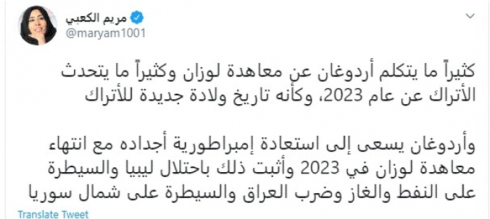 وكتبت في تغريدة عبر "تويتر" رصدها "المشهد العربي": "كثيراً ما يتكلم أردوغان عن معاهدة لوزان وكثيراً ما يتحدث الأتراك عن عام 2023، وكأنه تاريخ ولادة جديدة للأتراك".