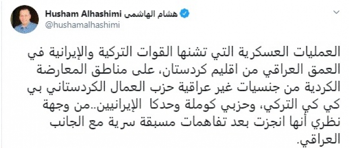 وقال في تغريدة عبر "تويتر" رصدها "المشهد العربي": "العمليات العسكرية التي تشنها القوات التركية والإيرانية في العمق العراقي من إقليم كردستان، على مناطق المعارضة الكردية من جنسيات غير عراقية حزب العمال الكردستاني بي كي كي التركي، وحزبي كوملة وحدكا الإيرانيين.. من وجهة نظري أنها انجزت بعد تفاهمات مسبقة سرية مع الجانب العراقي".