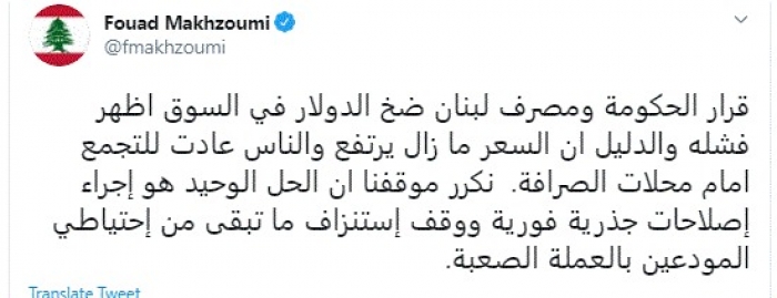 وقال في تغريدة عبر "تويتر" رصدها "المشهد العربي": "قرار الحكومة ومصرف لبنان ضخ الدولار في السوق أظهر فشله والدليل أن السعر ما زال يرتفع والناس عادت للتجمع أمام محلات الصرافة".