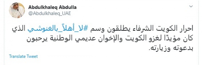 وقال في تغريدة عبر "تويتر" رصدها "المشهد العربي": "أحرار الكويت الشرفاء يطلقون وسم لا أهلاً بالغنوشي الذي كان مؤيدًا لغزو الكويت والإخوان عديمي الوطنية يرحبون بدعوته وزيارته".