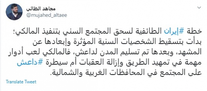 وقال في تغريدة عبر "تويتر" رصدها "المشهد العربي": "خطة إيران الطائفية لسحق المجتمع السني بتنفيذ المالكي؛ بدأت بتسقيط الشخصيات السنية المؤثرة وإبعادها عن المشهد، وبعدها تم تسليم المدن لداعش".