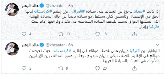 وقال في تغريدات عبر "تويتر" رصدها "المشهد العربي": "التوافق بين تركيا وإيران على قصف مواقع في إقليم كردستان، حيث تعرضت مواقع في الإقليم لقصف تركي وإيران مزدوج، يعكس عمق التحالف بين الإيرانيين والأتراك في العبث بالسيادة العربية".