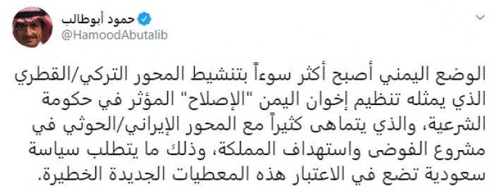 وكتب في تغريدة عبر "تويتر" رصدها "المشهد العربي": "الوضع اليمني أصبح أكثر سوءاً بتنشيط المحور التركي القطري الذي يمثله تنظيم إخوان اليمن الإصلاح المؤثر في حكومة الشرعية، والذي يتماهى كثيراً مع المحور الإيراني الحوثي في مشروع الفوضى واستهداف المملكة".
