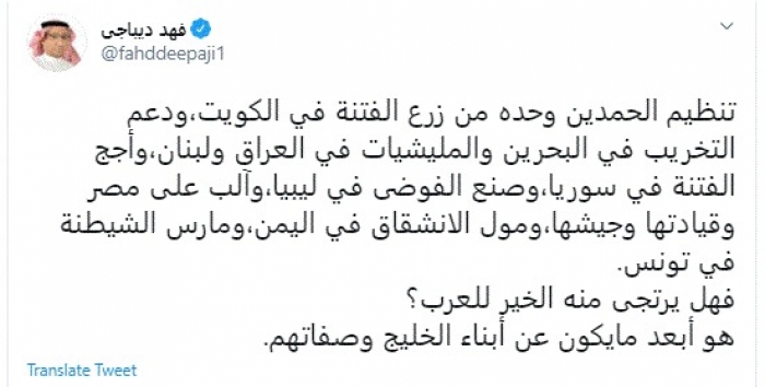 وأوضح: "فهل يرتجى منه الخير للعرب؟ هو أبعد ما يكون عن أبناء الخليج وصفاتهم".