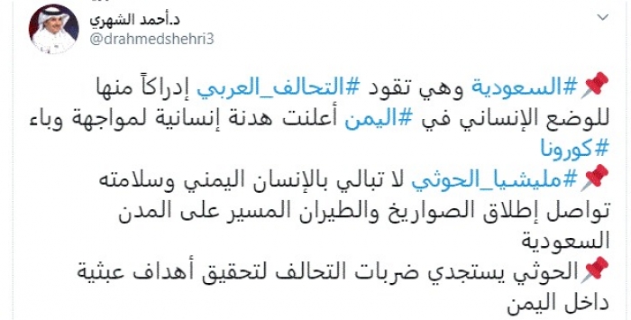 وقال في تغريدة عبر "تويتر" رصدها "المشهد العربي": "السعودية وهي تقود التحالف العربي إدراكاً منها للوضع الإنساني في اليمن أعلنت هدنة إنسانية لمواجهة وباء كورونا".