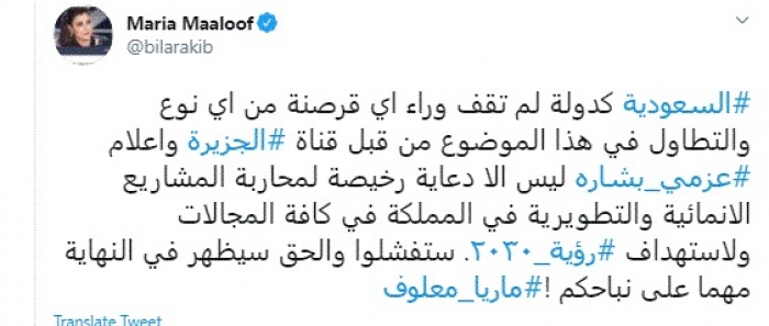 وكتبت في تغريدة عبر "تويتر" رصدها "المشهد العربي": "السعودية كدولة لم تقف وراء أي قرصنة من أي نوع والتطاول في هذا الموضوع من قبل قناة الجزيرة وإعلام عزمي بشاره ليس إلا دعاية رخيصة لمحاربة المشاريع الإنمائية والتطويرية في المملكة في كافة المجالات ولاستهداف رؤية ٢٠٣٠".
