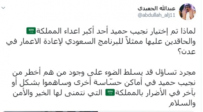 وتساءل عبر تغريدة له على "تويتر" رصدها " المشهد العربي": "لماذا تم اختيار نجيب حميد أحد أكبر أعداء المملكة والحاقدين عليها ممثلًا للبرنامج السعودي لإعادة الاعمار في عدن؟"