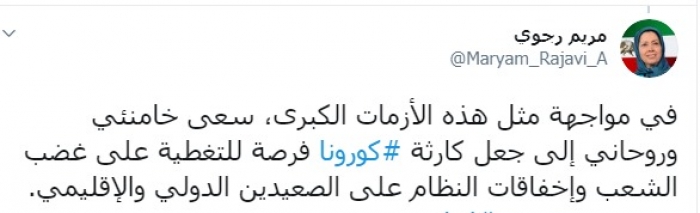 وكتبت عبر تغريدة لها على "تويتر" رصدها " المشهد العربي": "في مواجهة مثل هذه الأزمات الكبرى، سعى خامنئي وروحاني إلى جعل كارثة كورونا فرصة للتغطية على غضب الشعب وإخفاقات النظام على الصعيدين الدولي والإقليمي".