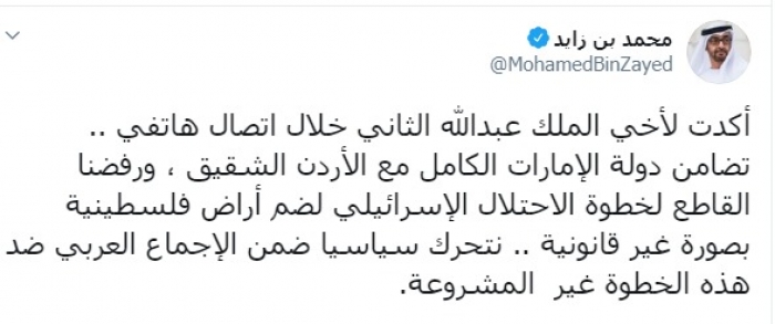 وكتب عبر تغريدة له على "تويتر" رصدها " المشهد العربي": "أكدت لأخي الملك عبدالله الثاني خلال اتصال هاتفي تضامن دولة الإمارات الكامل مع الأردن الشقيق، ورفضنا القاطع لخطوة الاحتلال الإسرائيلي لضم أراض فلسطينية بصورة غير قانونية".