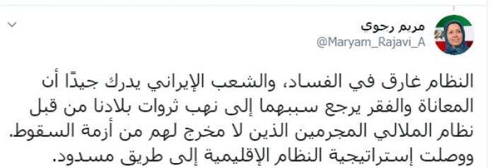 وكتبت عبر تغريدة لها على "تويتر" رصدها " المشهد العربي": "النظام غارق في الفساد، والشعب الإيراني يدرك جيدًا أن المعاناة والفقر يرجع سببهما إلى نهب ثروات بلادنا من قبل نظام الملالي المجرمين الذين لا مخرج لهم من أزمة السقوط، ووصلت استراتيجية النظام الإقليمية إلى طريق مسدود".