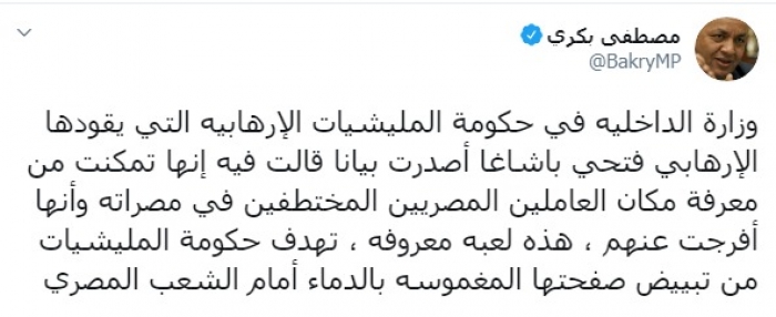 وكتب عبر تغريدة له على "تويتر" رصدها " المشهد العربي": "وزارة الداخلية في حكومة المليشيات الإرهابية التي يقودها الإرهابي فتحي باشاغا، أصدرت بيانا قالت فيه إنها تمكنت من معرفة مكان العاملين المصريين المختطفين في مصراتة وأنها أفرجت عنهم ، هذه لعبة معروفة، تهدف حكومة المليشيات من تبييض صفحتها المغموسة بالدماء أمام الشعب المصري".