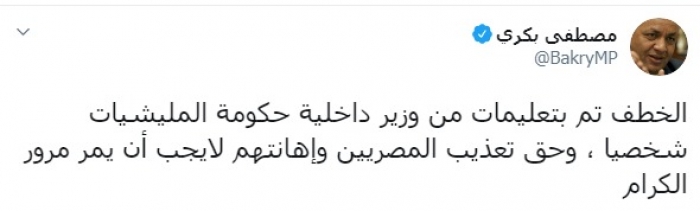 وأضاف:" الخطف تم بتعليمات من وزير داخلية حكومة المليشيات شخصيا، وحق تعذيب المصريين وإهانتهم لا يجب أن يمر مرور الكرام".