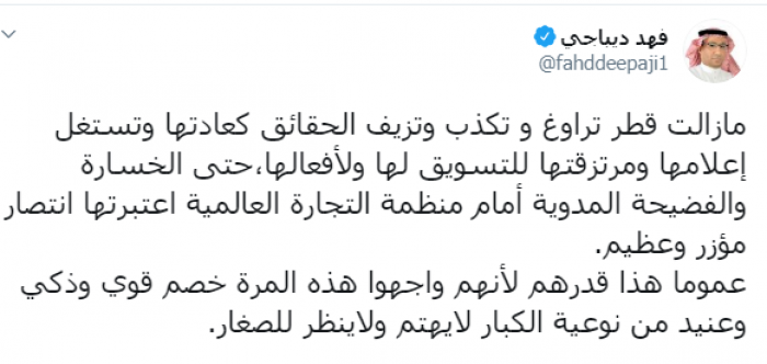 وكتب عبر تغريدة له على "تويتر" رصدها " المشهد العربي": "مازالت قطر تراوغ و تكذب وتزيف الحقائق كعادتها وتستغل إعلامها ومرتزقتها للتسويق لها ولأفعالها، حتى الخسارة والفضيحة المدوية أمام منظمة التجارة العالمية اعتبرتها انتصار مؤزر وعظيم".