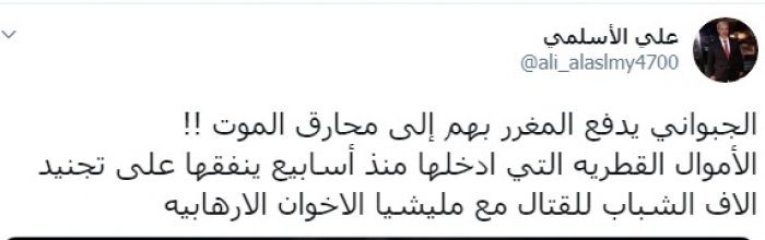 وكتب عبر تغريدة له على "تويتر" رصدها " المشهد العربي":"الجبواني يدفع المغرر بهم إلى محارق الموت، الأموال القطرية التي أدخلها منذ أسابيع ينفقها على تجنيد الأف الشباب للقتال مع مليشيا الإخوان الإرهابية".