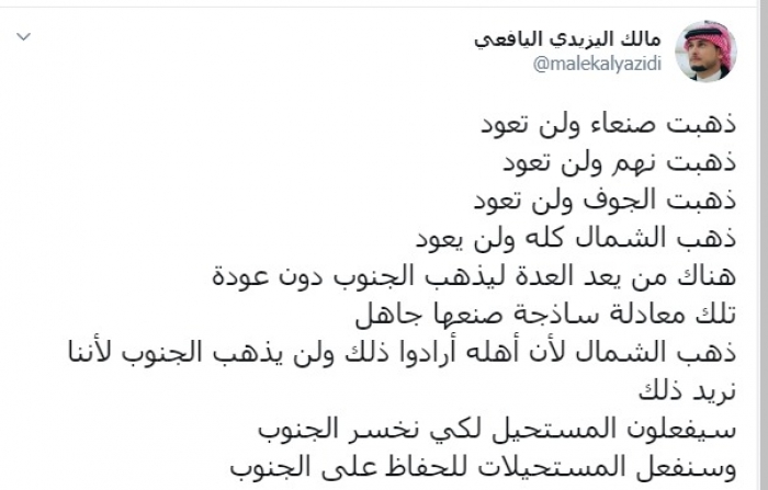 وكتب عبر تغريدة له على "تويتر" رصدها " المشهد العربي": "ذهبت صنعاء ولن تعود، ذهبت نهم ولن تعود، ذهبت الجوف ولن تعود، ذهب الشمال كله ولن يعود".