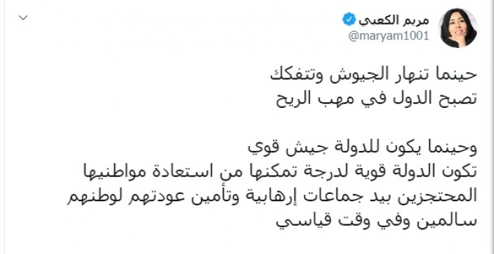 وكتبت عبر تغريدة لها على "تويتر" رصدها " المشهد العربي": "حينما تنهار الجيوش وتتفكك، تصبح الدول في مهب الريح، وحينما يكون للدولة جيش قوي، تكون الدولة قوية لدرجة تمكنها من استعادة مواطنيها المحتجزين بيد جماعات إرهابية وتأمين عودتهم لوطنهم سالمين وفي وقت قياسي".