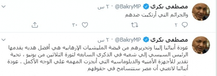 وكتب عبر تغريدة له على "تويتر" رصدها " المشهد العربي":"عودة أبنائنا إلينا وتحريرهم من قبضة المليشيات الإرهابية هي أفضل هدية يقدمها الرئيس السيسي إلى شعبه في الذكري السابعة لثورة الثلاثين من يونيو ، تحية تقدير للأجهزة الأمنية والدبلوماسية التي أنجزت المهمة علي الوجه الأكمل".
