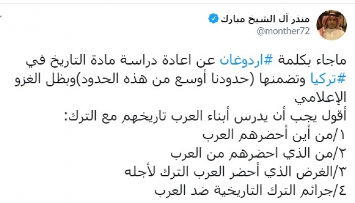 وكتب عبر تغريدة له على "تويتر" رصدها " المشهد العربي": "ماجاء بكلمة أردوغان عن إعادة دراسة مادة التاريخ في تركيا وتضمنها(حدودنا أوسع من هذه الحدود) وبظل الغزو الإعلامي، أقول يجب أن يدرس أبناء العرب تاريخهم مع الترك:من أين أحضرهم العرب، من الذي أحضرهم من العرب، الغرض الذي أحضر العرب الترك لأجله، جرائم الترك التاريخية ضد العرب".