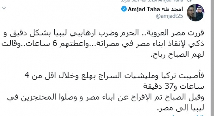 وكتب عبر تغريدة له على "تويتر" رصدها " المشهد العربي" :"قررت مصر العروبة، الحزم وضرب إرهابيي ليبيا بشكل دقيق و ذكي لإنقاذ أبناء مصر في مصراتة، وأعطتهم 6 ساعات، وقالت لهم الصباح رباح".