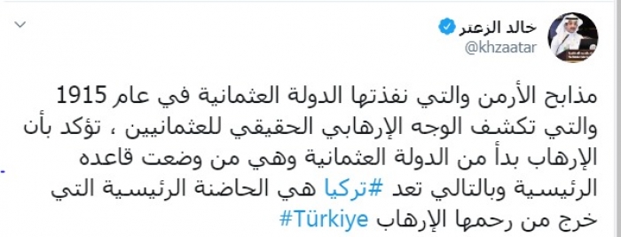 وكتب عبر تغريدة له على "تويتر" رصدها " المشهد العربي":"مذابح الأرمن والتي نفذتها الدولة العثمانية في عام 1915 والتي تكشف الوجه الإرهابي الحقيقي للعثمانيين ، تؤكد بأن الإرهاب بدأ من الدولة العثمانية وهي من وضعت قواعده الرئيسية وبالتالي تعد تركيا هي الحاضنة الرئيسية التي خرج من رحمها الإرهاب".