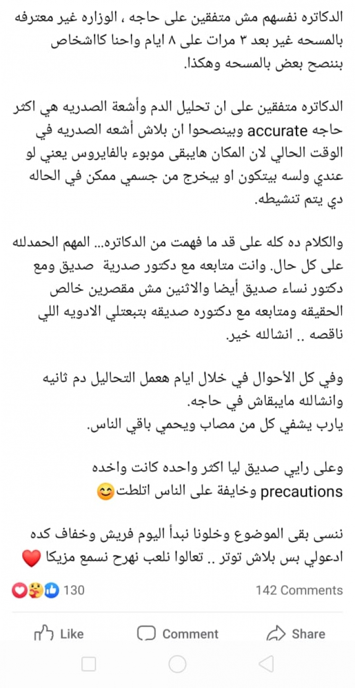 وأضافت: "البوست ده كان لخوفي على من تعامل معي ولازم أعترف إني اتوترت جدًا بعد لما نزل، لأني لقيت ناس وصحفيين معرفهمش بيكلموني وده موتر جدا لشخص مثلي؛ لأنه عكس طبيعتي، المهم أحب أطمن الناس إن الحمد لله أنا أحسن من غيري".