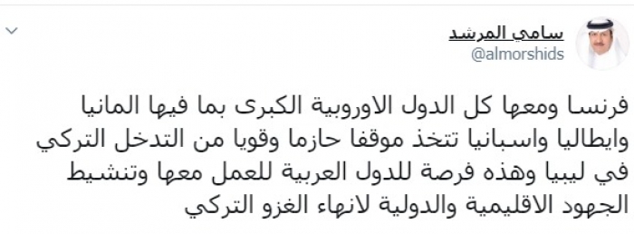 وكتب عبر تغريدة له على "تويتر" رصدها " المشهد العربي":"فرنسا ومعها كل الدول الأوروبية الكبرى بما فيها ألمانيا وإيطاليا وإسبانيا تتخذ موقفا حازما وقويا من التدخل التركي في ليبيا وهذه فرصة للدول العربية للعمل معها وتنشيط الجهود الإقليمية والدولية لإنهاء الغزو التركي".