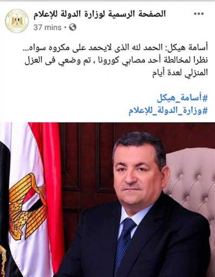 أعلن أسامة هيكل، وزير الدولة للإعلام بمصر، وضعه في العزل المنزلي لعدة أيام لمخالطته أحد مصابي "كورونا".