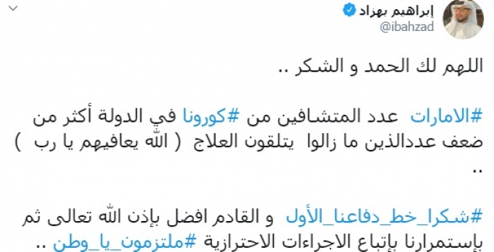 وكتب عبر تغريدة له على "تويتر" رصدها " المشهد العربي": "اللهم لك الحمد و الشكر، الإمارات عدد المتشافين من كورونا في الدولة أكثر من ضعف عدد الذين ما زالوا يتلقون العلاج( الله يعافيهم يا رب)".