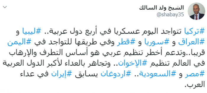 وكتب عبر تغريدة له على "تويتر" رصدها " المشهد العربي": "تركيا تتواجد اليوم عسكريا في أربع دول عربية، ليبيا والعراق و سوريا و قطر وفي طريقها للتواجد في اليمن قريبا، وتدعم أخطر تنظيم عربي هو أساس التطرف والإرهاب في العالم تنظيم الإخوان، وتجاهر بالعداء لأكبر الدول العربية مصرو السعودية"