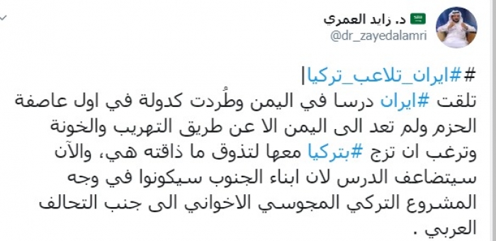 وكتب عبر تغريدة له على "تويتر" رصدها " المشهد العربي": "تلقت إيران درسًا في اليمن وطُردت كدولة في أول عاصفة الحزم، ولم تعد إلى اليمن إلا عن طريق التهريب والخونة، وترغب أن تزج بتركيا معها لتذوق ما ذاقته هي، والآن سيتضاعف الدرس لأن أبناء الجنوب سيكونوا في وجه المشروع التركي المجوسي الإخواني إلى جنب التحالف العربي".