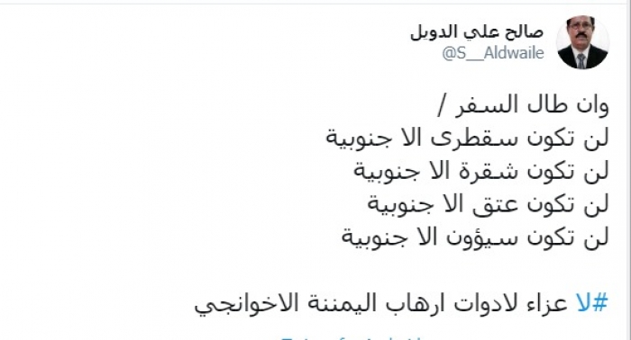 وكتب عبر تغريدة له على "تويتر" رصدها " المشهد العربي": "وأن طال السفر، لن تكون سقطرى إلا جنوبية، و لن تكون شقرة إلا جنوبية، لن تكون عتق إلا جنوبية، لن تكون سيئون إلا جنوبية".