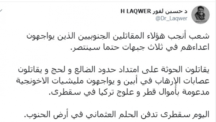 وكتب عبر تغريدة له على "تويتر" رصدها " المشهد العربي":"شعب أنجب هؤلاء المقاتلين الجنوبيين الذين يواجهون أعداءهم في ثلاث جبهات حتما سينتصر".