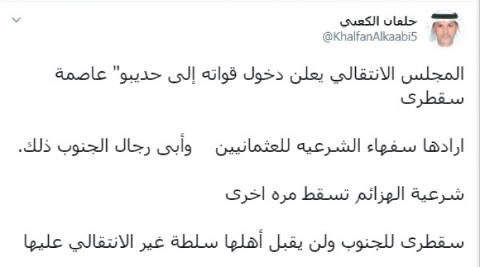 وكتب عبر تغريدة له على "تويتر" رصدها " المشهد العربي" :"المجلس الانتقالي يعلن دخول قواته إلى حديبو" عاصمة سقطرى، أرادها سفهاء الشرعية للعثمانيين وأبى رجال الجنوب ذلك".