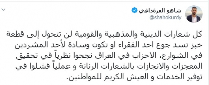 وكتب عبر تغريدة له على "تويتر" رصدها " المشهد العربي": "كل الشعارات الدينية والمذهبية والقومية لن تتحول إلى قطعة خبز تسد جوع أحد الفقراء أو تكون وسادة لأحد المشردين في الشوارع، الأحزاب في العراق نجحوا نظرياً في تحقيق المعجزات والإنجازات بالشعارات الرنانة و عملياً فشلوا في توفير الخدمات و العيش الكريم للمواطنين".