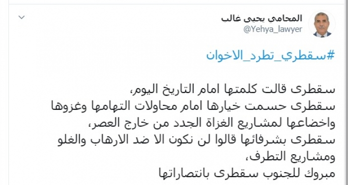 أكد الناشط السياسي المحامي يحيى غالب، اليوم الجمعة، أن سقطرى أسقطت مشاريع الإرهاب والتطرف.