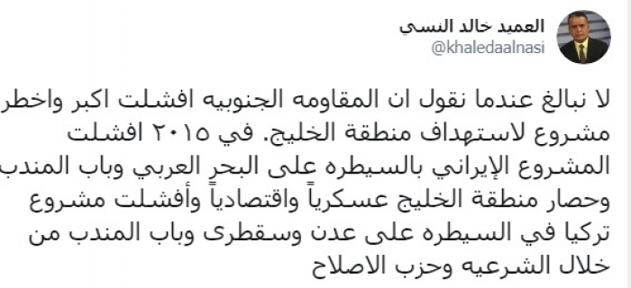 أكد الكاتب والمحلل العسكري، العميد خالد النسي، أن المقاومة الجنوبية أفشلت أكبر وأخطر مشروع لاستهداف منطقة الخليج.