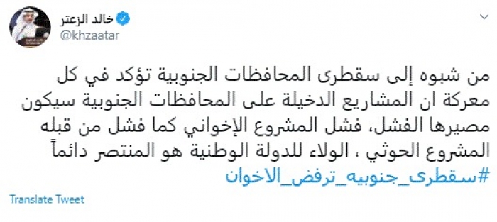 تفاعل المحلل السياسي السعودي خالد الزعتر، مع هاشتاج سقطرى جنوبية ترفض الإخوان، مؤكدًا أن المشاريع الدخيلة على الجنوب سيكون مصيرها الفشل.