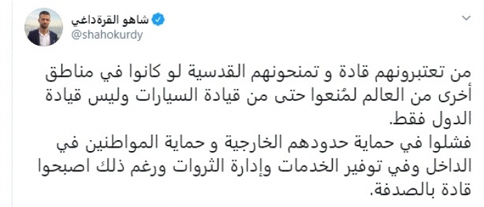 وقال في تغريدة عبر "تويتر" رصدها "المشهد العربي": "من تعتبرونهم قادة وتمنحونهم القدسية لو كانوا في مناطق أخرى من العالم لمُنعوا حتى من قيادة السيارات وليس قيادة الدول فقط".